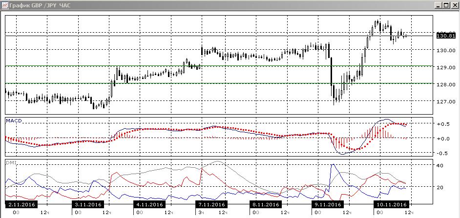 На дневном графике пара после выхода из диапазона 126,25-128 достигла нового максимума в среду. Уровнем поддержки при реакции рынка на информацию о победе в США Трампа стал уровень 128,00, бывший уровень сопротивления. Это соответствует картине выхода из диапазона к росту. В среду образовался «молот», что также в пользу дальнейшего движения вверх. Так как пара выше уровня 130,00 — уровня минимумов в июле, августе и сентябре, то это открывает пространство для дальнейшего роста уже без сильных сопротивлений рядом, с целью около 139,00 (максимумы июля и сентября).