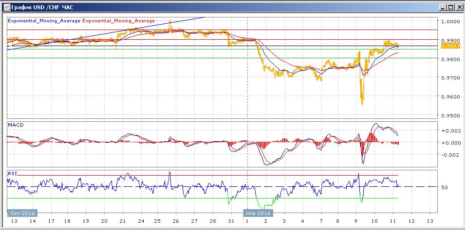 показав в среду динамику более чем в 250 пунктов, пара закрылась с небольшим ростом чуть ниже 0.9850. вчера рост продолжился, пара преодолела сопротивление на 0.9850 с закрытием на 0.9875. сегодняшние торги проходят с небольшим снижением пары. Средние скользящие ЕМА21 и ЕМА55 направлены вверх и растут. Индикаторы MACD и RSI находятся выше своих центральных линий и снижаются. Цели вверх: 0. 9900. Цели вниз: 0.9850, 0.9800