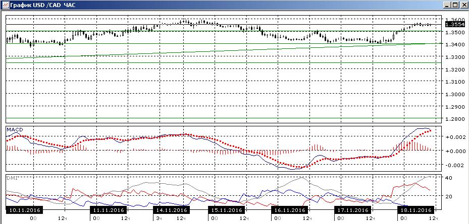 На четырёхчасовом графике хорошо проявилась поддержка на уровне 1,3400 (около этого уровня были колебания с конце октября — начале ноября) и на линии восходящего тренда. Получение поддержки на 1,3400 показывает, что тенденция роста сохраняется. На часовом графике она является сильной. Около 1,3550 начала консолидация — пара находится в узком диапазоне, и дальнейшая краткосрочная перспектива должна определиться направлением отхода от 1,3550. По ADX тенденция роста остаётся очень сильной, и скорее рост будет продолжаться — или от текущего уровня, или от уровня поддержки на 1,3500.