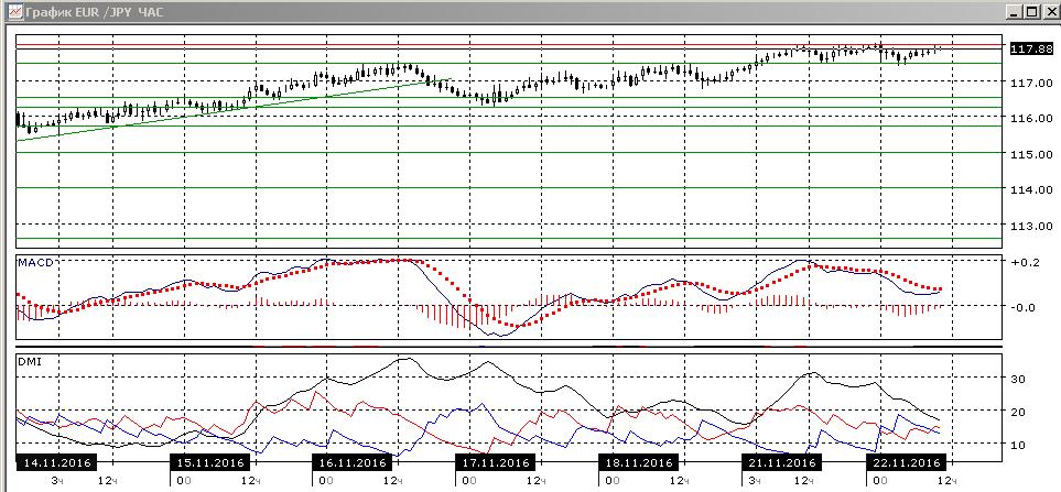 На четырехчасовом графике продолжается последовательный рост, относительные максимумы и минимумы пары растут. По ADX тенденция роста остаётся устойчивой, превышение DM+ над DM- стабильное при относительно высоком уровне ADX. Рост, однако, сейчас замедлятся: по графику это видно по уменьшению наклона волн роста с 9 ноября. По индикаторам это видно по образованию тройного медвежьего расхождения гистограммы MACD и максимумов пары. Это увеличивает вероятность отката, и достижение максимумов июля может быть поводом для коррекции, поэтому в этом масштабе риск для роста относительно высок на данный момент.