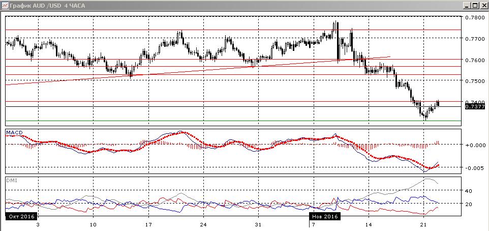 На четырёхчасовом графике также наблюдается коррекционное движение, тенденция снижения пары не нарушена, отскок приостановился около 0,7400. Последовательность снижения относительных максимумов и минимумов пары сохраняется. По индикаторам направленного движения — коррекция к снижению: гистограмма MACD растёт, линия MACD также развернулась, но превышение DM- над DM+ сохраняется при высоком уровне ADX. Как и в дневном масштабе, стоит ожидать возобновления снижения с движением к 0,7300 — точке, близкой к началу отскока.