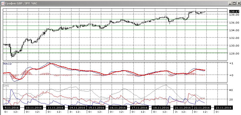 На четырёхчасовом графике видно замедление роста, сохраняется медвежье расхождение максимумов пары и гистограммы MACD. Последовательность роста относительных максимумов и минимумов пары не нарушена, по ADX тенденция роста остаётся сильной — превышение DM+ над DM- остаётся устойчивым при высоком уровне ADX. Тенденция роста видна хорошо, и скорее она будет продолжаться. На часовом графике пара получила поддержку на 138,00, чуть далее поддержки можно ожидать на относительных максимумах 18 и 21 ноября около 137,50. Относительные минимумы пары продолжают расти, и ближайшей целью видится тестирование уровня 139,00.