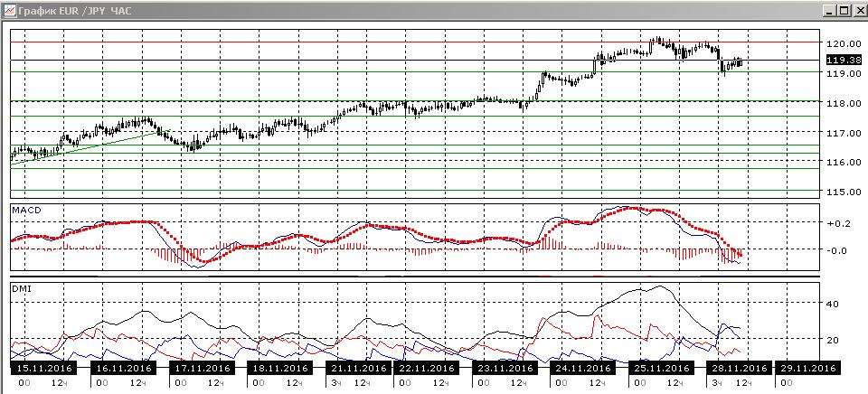 На четырехчасовом графике пара перешла к снижению после тестирования уровня 120,00. Относительные максимумы и минимумы пары сейчас снижаются, по индикаторам направленного движения пара также перешла к снижению: гистограмма MACD снижается в отрицательной зоне, лини MACD направлена вниз, превышение DM+ над DM- уже нет. Размер снижения пока не выходит за рамки коррекции, и поддержки можно ожидать на 118,00 — уровень, к которого происходила консолидация 21-23 ноября. Скорее, стоит искать момент возобновления роста после коррекции. На часовом графике пара также перешла к снижению — относительные максимы и минимумы пары теперь снижаются.