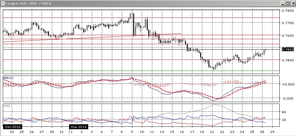 На четырёхчасовом графике пара перешла к росту: относительные максимумы и относительные минимумы растут, по индикаторам направленного движения тенденцией стал рост: DM+ выше DM-, гистограмма MACD остаётся в положительной зоне, линия MACD имеет положительный наклон. Вместе с тем, рост замедляется, это видно по образованию медвежьего расхождения максимумов пары и гистограммы MACD. Пара уже близко к уровню 0,7500, и дальнейшая перспектива, вероятно, определится тестированием этого уровня: при прорыве выше 0,7525 рост, вероятно, продолжится, при откате более вероятным видится снижение к исходному пункту коррекции 0,7300.