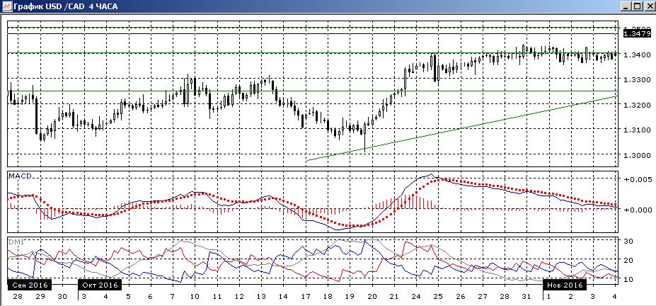 На четырёхчасовом графике скорее видная консолидация — сильная поддержка на 1,3400, от которой идут волны роста, и постепенно снижающиеся с 14 ноября относительные максимумы. В рамках движения в диапазоне предпочтительно снижение — на 1,3540, возможно, образуется двойная вершина, пара приближается к промежуточному минимуму. При дальнейшем снижении целью видится уровень 1,3400, что будет немного ниже диапазона разворотной фигуры.
