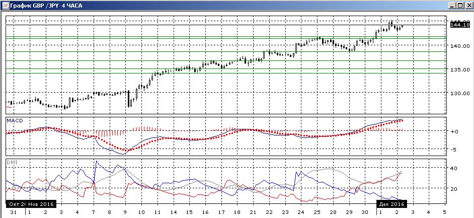 На четырёхчасовом графике последовательный рост пары продолжается. После преодоления уровня 141,30 можно рассматривать его как ближайший сильный уровень поддержки. По ADX тенденция очень сильная: превышение DM+ над DM- большое и увеличивается, ADX находится на высоком уровне и растёт. Признаков возможного разворота сейчас не видно. Ближайшая цель — возвращение к уровню 145,00, около максимума первого декабря., далее рост скорее продолжится.