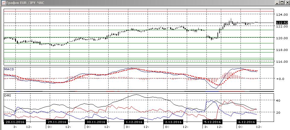 На четырехчасовом графике двойственная ситуация. С одной стороны пара закрепилась выше уровня предыдущего сопротивления на 122,00. Откат в начале понедельник приостановился у уровня поддержки 120,00 (около вершины 25 ноября). С другой стороны, образовалось медвежье расхождение пары и гистограммы MACD. Образование «падающей звезды» не привело к созданию разворотной комбинации, скорее это показывает, что при наличии предпосылок к развороту он не поддерживается, поэтому пока пара выше 122,00, продолжение роста выглядит предпочтительным. Закрепление ниже 122,00 дало бы основания для более существенной коррекции и возвращению к 120,00.
