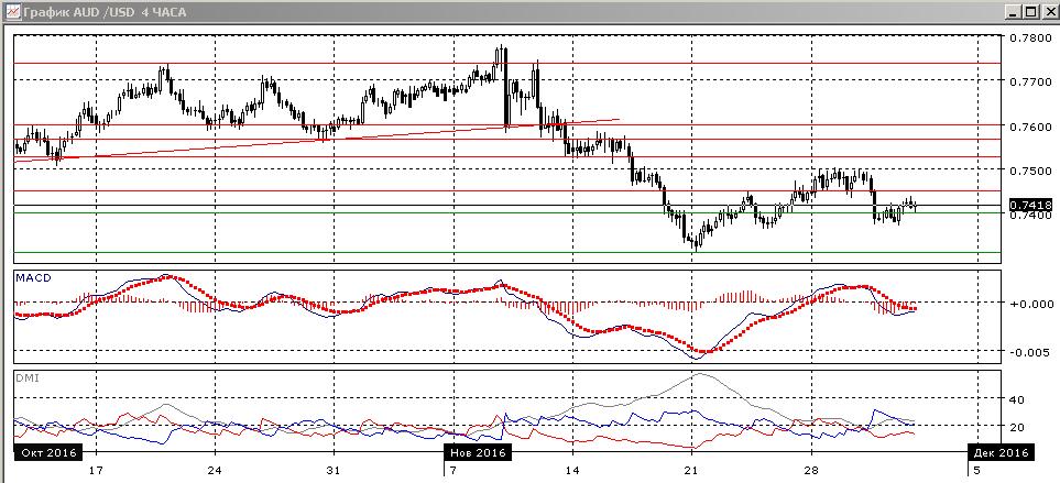 На четырёхчасовом графике у 0,7500 образовалась разворотная комбинация с «падающей звездой», немного шире — это возможная двойная вершина на 0,7500. Скорее, пара будет снижаться, целью видится уровень минимумов 24 ноября — 1 декабря на 0,7370. По индикаторам направленного движения — флэт, что поддерживает движение в канале. На часовом графике относительные максимумы и минимумы пары стали последовательно снижаться. За 0,7450 следующий сильный уровень поддержки — на 0,7400.