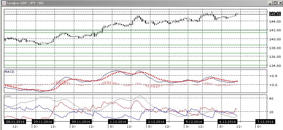 На четырёхчасовом графике похожая ситуация, но возможность отката больше. В этом масштабе тенденция по ADX также сильная, и образовалось медвежье расхождение максимумов пары и гистограммы MACD. Однако пара сейчас выросла выше уровня максимума 1 декабря около 145,00, и закрепление выше показало бы, что рост продолжается. Возвращение ниже 145,00 при образовании ранее «падающей звезды» около этого уровня повысило бы вероятность отката пары. Ближайшая сильная поддержка на 141,30. На часовом графике сохраняется рост относительных минимумов пары, она приближается к вчерашнему максимуму. Пока кажется, что из примерно нейтральной ситуации около 145,00 пара выходит вверх.
