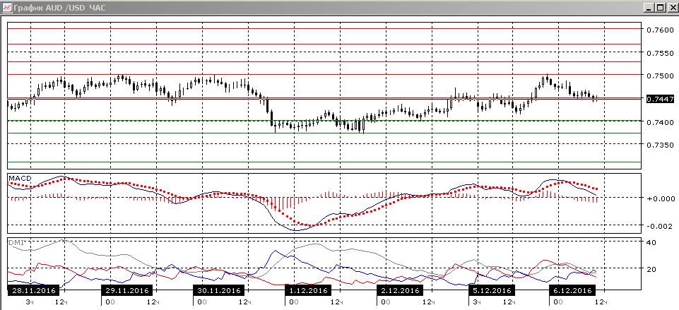 На дневном графике пара снизилась до уровня 1,3250, который является верхней границе долгосрочного канала с мая. Поддержка на этом уровне, скорее, будет сильной. В этом случае можно ожидать отскока к уровню середины треугольника около 1,3500. Без учёта влияния уровня 1,3250 пара перешла к снижению — относительные максимумы и минимумы пары последовательно снижаются с 1,36, пара закрепилась ниже линии восходящего тренда. По индикаторам направленного движения тенденцией является снижение — DM- выше DM+, гистограмма MACD находится в отрицательной зоне, линия MACD имеет отрицательный наклон.