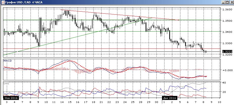 На дневном графике закрытие в среду было ниже ключевого уровня сопротивления 1,3250, который является верхним уровнем канала с мая. Кроме этого, пара теперь ниже ноябрьского относительного минимума. Препятствия для снижения пары теперь ниже, и более вероятным кажется разворот тенденции на снижение. По индикаторам направленного движения изменение тенденции также видно: гистограмма MACD находится в отрицательной зоне, линия MACD имеет отрицательный наклон, превышение DM- над DM+ большое и устойчивое. Следующий уровень сильной поддержки в этом масштабе — на 1,3000. Уровень 1,3250 может выступить для пары уже сопротивлением, как и ранее.