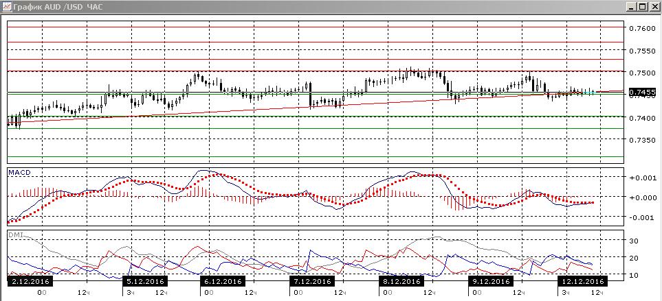 На четырёхчасовом графике относительные максимумы пары уже снижаются. Около 0,75000 с конца ноября уже четыре вершины, что увеличивает вероятность возобновления снижения от этого уровня. Пара сейчас находится на линии треда, которая находится рядом с уровнем поддержки 0,7450. Снижение ниже этого уровня открыло бы дорогу к дальнейшему снижению пары. На часовом графике у 0,7450 образуется ряд свечей «дожи». Скорее, дальнейшее движение будет в направлении выхода от этого уровня.