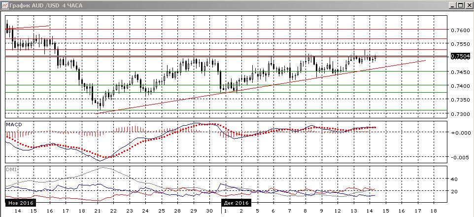 На четырёхчасовом графике также картина движения в треугольнике, образованном линией восходящего тренда с 21 ноября и уровнем 0,7500. У 0,7500 образовалась «падающая звезда», но отката от 0,7500 не произошло. Выход из треугольника близок, и скорее дальнейшее движение будет в направлении выхода пары из треугольника.