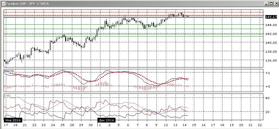 На четырёхчасовом графике пара остаётся выше уровня сопротивления в начале декабря на 145,50, это подтверждает версию преодоления уровня сопротивления, и сейчас уровень 145,50 скорее выступит для пары поддержкой. По ADX тенденцией остаётся рост пары, превышение DM+ над DM- сохраняется. При снижении ниже 145,50 пара преодолеет предыдущий относительный минимум, что тогда становится более значительно снижение ниже 145,50. Дальнейшее движение, скорее, будет определяться реакцией рынка на решение и комментарии FOMC, что делает технический анализ в краткосрочном масштабе в данный момент менее актуальным.
