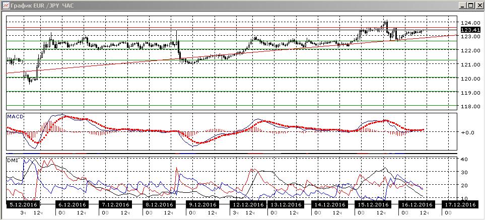 На четырёхчасовом графике возможного разворота не видно: пара получила поддержку на 122,65 после отката от 124,00, также рост был от линии восходящего тренда с ноября. Отскок вверх от бывшего уровня сопротивления соответствует картине роста после преодоления уровня, поэтому пока разворота нет, предпочтительно продолжение тенденции роста. По ADX тенденция роста в этом масштабе усиливается. Ближайшей целью видится достижение предыдущего относительного максимума на 124,13. На часовом графике ситуия скорее нейтральная — хотя пара остаётся выше линии тренда и выше уровней поддержки на 123 и 122,65, рост приостановился ниже предыдущего относительного максимума, и относительные максимумы и минимумы сейчас снижаются. Несмотря на это, пока пара выше линии тренда и уровня поддержки 122,65, возобновление роста видится предпочтительным.