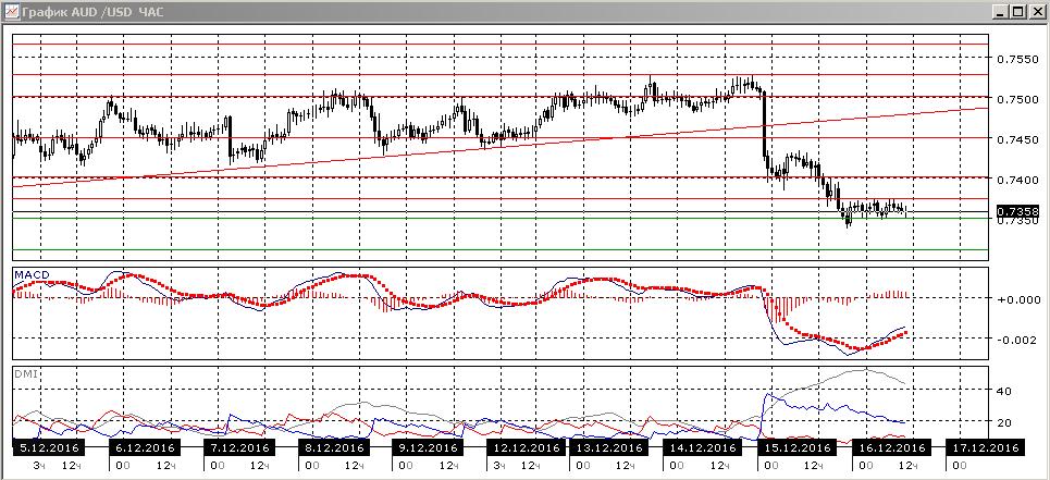 На четырёхчасовом графике происходит консолидация выше 0,7350, но ниже 0,7375 (преодолённого уровня поддержки). Скорее, после консолидации последует продолжение снижения с целью на 0,7310 (минимум 21 ноября). По индикаторам направленного движения тенденцией стало снижение: DM- существенно выше DM+, гистограмма MACD остаётся в отрицательной зоне, линия MACD сохраняет отрицательный наклон.