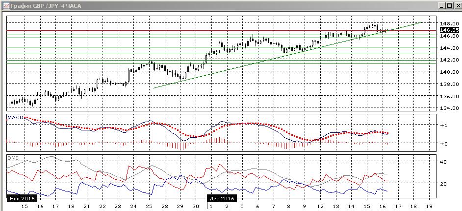 На четырёхчасовом графике пара получила поддержку на уровне 146,00, ранее он выступал для пары сопротивлением. Хотя вершина с «падающей звездой» образовалась и в этом масштабе, здесь признаки возможного разворота менее выражены, но то есть. Как и на дневном графике, здесь образовалось медвежье расхождение максимумов пары и гистограммы MACD – если это происходит в разных таймфреймах, но это, возможно, усиливает сигнал. Ключевым уровнем поддержки сейчас можно рассматривать 145,50 — уровень сопротивления 5-6 декабря и поддержки 12-14 декабря. При снижении ниже этого уровня последовательность роста относительных минимумов была бы нарушена, и пара преодолела краткосрочную линию тренда по минимумам с конца ноября.