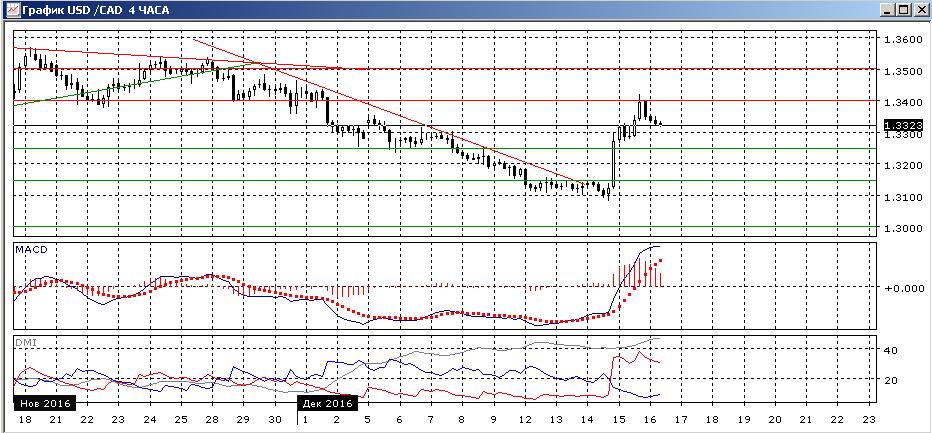 На четырёхчасовом графике хорошо видна картина перехода к росту пары после преодоления уровня 1,3150 после заседания FOMC. Текущий откат от 1,3400 не выходит за рамки коррекционного. Скорее, после коррекции рост пары возобновится. Как и в дневном масштабе, ключевой уровень поддержки — 1,3250, этот уровень проявлялся 2-8 декабря как уровень поддержки и сопротивления.