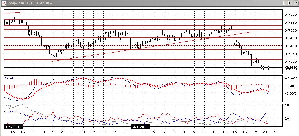 На четырёхчасовом графике пара получила поддержку на 0,7250. Коррекции вверх от этого уровня пока нет, но нижние тени свечей показывают, что снижение сейчас не поддерживается. Скорее, снижение пары возобновится. По индикаторам направленного движения тенденцией также является снижение, хотя тенденция по ним слабая, и имеется бычье расхождение минимумов пары и гистограммы MACD, что увеличивает вероятность отскока.