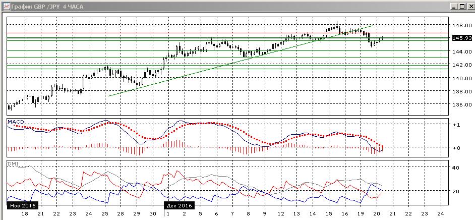 На четырёхчасовом графике пара перешла к снижению: относительные максимумы и минимумы пары снижаются с 15 декабря. Пара преодолела уровень предыдущего относительного минимума и находящуюся рядом зону поддержи у 145,50. По индикаторам направленного движения пара перешла к снижению: DM- сейчас выше DM+, гистограмма MACD снижается в отрицательной зоне, линия MACD сохраняет отрицательный наклон. Ближайшее сопротивление — на 146,70. Скорее, снижение пары в этом масштабе будет продолжаться с целью на 143,00 (сильный уровень поддержки).