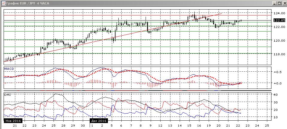 На дневном графике пара немного выросла от уровня поддержки 122,00, однако отскок остаётся в пределах свечи снижения понедельника, ниже линии тренда с начала ноября и ниже ключевого сопротивления на 123,60. В этом масштабе последовательность роста относительных максимумов и минимумов пары не нарушена, но вероятность разворота остаётся повышенной.