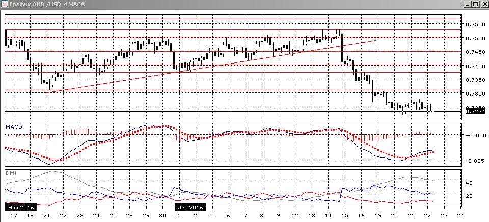 На дневном графике пара вернулась к предыдущему минимуму на 0,7220. Несмотря на образование «молота» во вторник, разворота не произошло. Возвращение пары к предыдущему минимуму делает более вероятным продолжение снижения. В остальном ситуация прежняя, пока пара ниже сопротивления на 0,7300, продолжение снижения видится предпочтительным. По индикаторам направленного движения пара также перешла к снижению: DM- существенно выше DM+, гистограмма MACD находится в отрицательной зоне, линия MACD сохраняет отрицательный наклон.