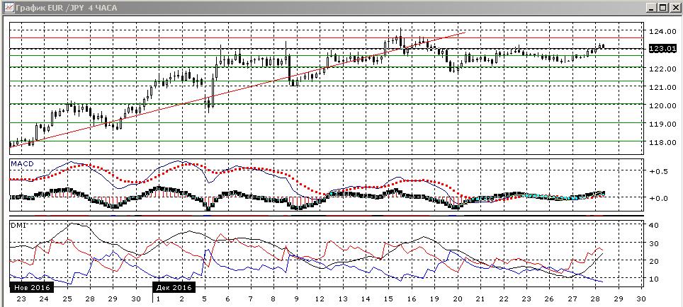 На четырёхчасовом графике пара перешла к росту после преодоления уровня сопротивления на 123,00, что делает вероятным продолжение роста до 123,60 и далее до 124 (около максимума 15 декабря), пока пара выше 122,65. По индикаторам направленного движения пара перешла к росту: DM+ выше DM-, ADX растёт. Цель на 123,60 примерно соответствует цели измеренного движения, равной волне роста 19-22 декабря.