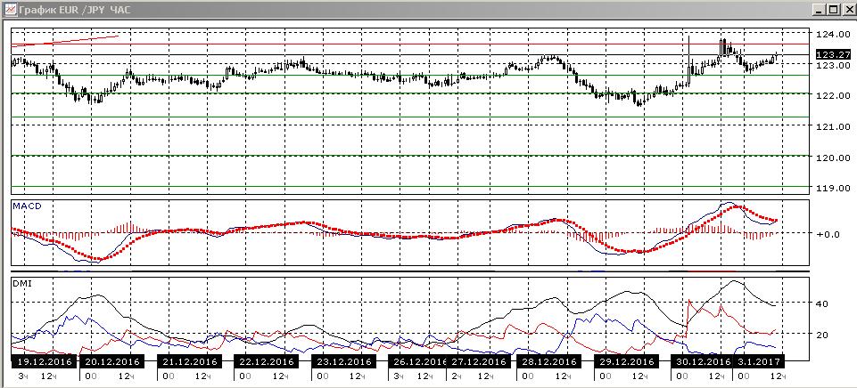 На четырёхчасовом графике пара находится сейчас около максимумов 22 и 28 декабря, около уровня сопротивления на 123,00. От 124,00 пара несколько раз откатилась уже при волне роста от 122,00, с образованием хорошо выраженных «падающих звёзд». Это делает сопротивление на 123,60 более устойчивым, пока импульса к преодолению этого уровня не видно. В рамках движения в канале 122-124 более вероятно снижение к нижней границе, так как к верхней пара уже приближалась.
