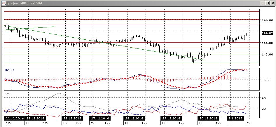 На четырёхчасовом графике пара переходит к росту: был преодолён уровень сопротивления на 144,00 и сейчас пара выше относительного максимума 28 декабря, что открывает дорогу к дальнейшему росту до следующего уровня сопротивления на 146,00. По индикаторам направленного движения пара также перешла к росту: DM+ выше DM-, гистограмма MACD растёт в положительной зоне, линия MACD имеет положительный наклон. На часовом графике вероятность отката увеличивается, так как образовалось медвежье расхождение максимумов пары и гистограммы MACD, однако пока тенденция роста сохраняется и скорее рост продолжится.
