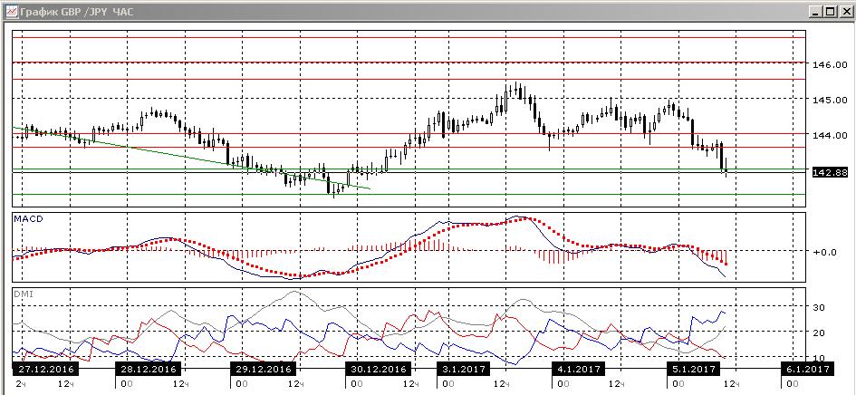 На четырёхчасовом графике важно снижение ниже уровня поддержки 143,60, который проявлялся с 23 декабря. Из консолидации в январе между 143,60 и 145,00 пара вышла вниз. Это делает более предпочтительным продолжение снижения пары до относительного минимума 29 декабря около 142,30.