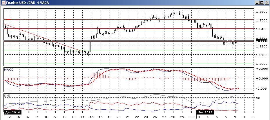 На четырёхчасовом графике пара снижается, тенденция сохраняется — последовательность снижения относительных максимумов и минимумов пары от 1,3600 не нарушена. Тенденция снижения, однако, замедляется — это видно по образованию бычьего расхождения минимумов пары и гистограммы MACD. Гистограмма MACD сейчас растёт и вышла в положительную область, линия MACD развернулась. Это увеличивает вероятность отскока вверх от 1,3200, поэтому сейчас, скорее, стоит действовать в направлении выхода пары за границы 1,3200-1,3250.