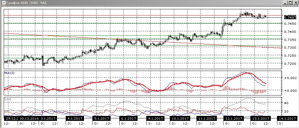 На четырёхчасовом графике похожая картина — рост продолжается, ослабления тенденции не видно, по индикаторам направленного движения тенденция подтверждается. Около 0,7500 рост пары приостановился, но отката от уровня вниз также пока не наблюдается. Скорее, стоит ожидать возобновления роста пары при закреплении выше 0,7500.