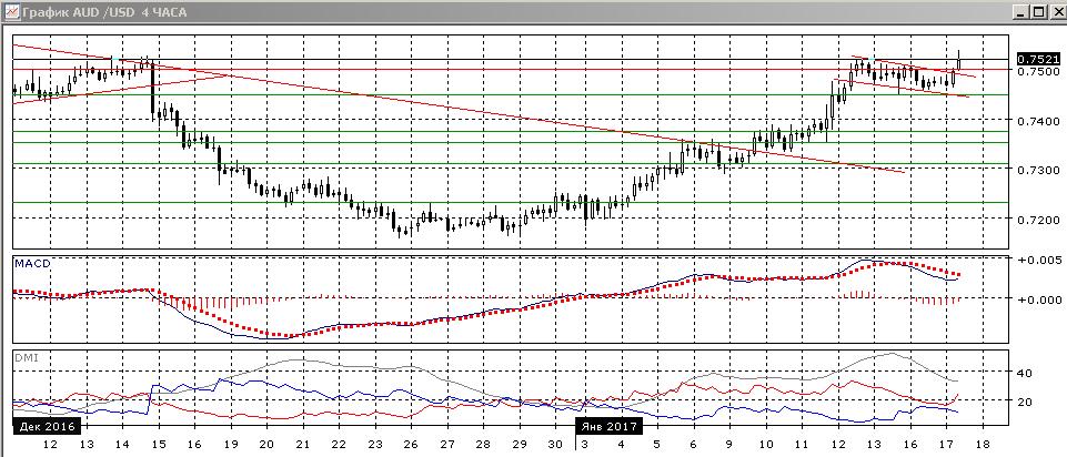 На дневном графике пара остаётся около важного уровня сопротивления 0,7500. Закрытие сегодня может быть выше этого уровня, что было бы важным знаком. Пока, однако, этого не произошло. В остальном ситуация мало изменилась: предпочтительно, что рост продолжится, последовательность роста относительных максимумов и минимумов пары сохраняется, по индикаторам направленного движения тенденцией является рост: DM- значительно выше DM+, ADX растёт, гистограмма MACD в положительной зоне, линия MACD сохраняет положительный наклон. Для того, чтобы рассчитывать на рост, стоит дождаться закрытия выше 0,7500.