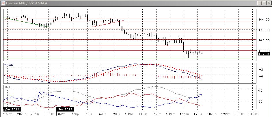 На четырёхчасовом графике происходит консолидация после снижения от 140,00 ниже 138,00. Скорее, далее снижение будет продолжаться, так как разворота не видно, а текущая стабилизация не превратилась даже в отскок. По индикаторам направленного движения в этом масштабе тенденция также хорошо выражена: превышение DM- над DM+ увеличивается, ADX растёт, гистограмма MACD остаётся в отрицательной зоне, линия MACD сохраняет отрицательный наклон.