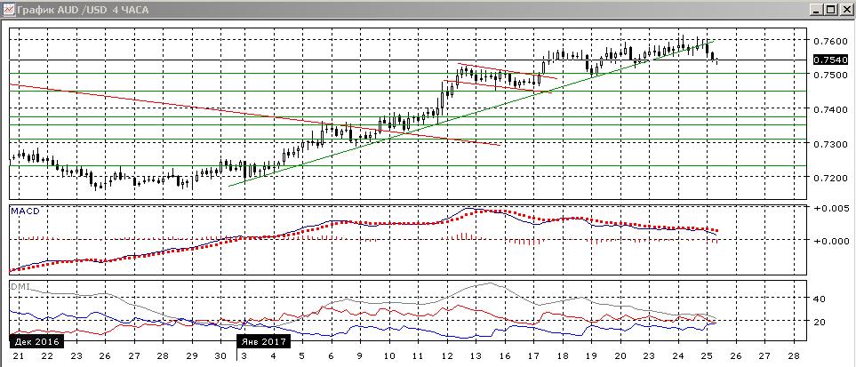 На дневном графике пара остаётся ниже 0,7600, верхние тени последних свечей только касались этого уровня, но далее пара снизилась ниже линии восходящего тренда с начала января. Важным является, какое будет закрытие дня — выше или ниже линии тренда. Учитывая, что преодоление тренда произошло как после образования технических предпосылок (замедления роста, образования медвежье расхождения максимумов пары и гистограммы MACD), так и после вышедших хуже ожиданий данных по индексу потребительских цен в четвёртом квартале, при закрытии около текущего уровня будет сигнал разворота. Ближайшей целью снижения видится уровень поддержки на 0,7500 — ранее это был сильный уровень сопротивления. По ADX тенденция роста остаётся очень сильной: превышение DM+ над DM- большое, ADX растёт. Гистограмма MACD остаётся в положительной области, линия MACD сохраняет положительный наклон, последовательность роста относительных максимумов и минимумов пары не нарушена, поэтому на 0,7500 пару может ждать сильная поддержка.