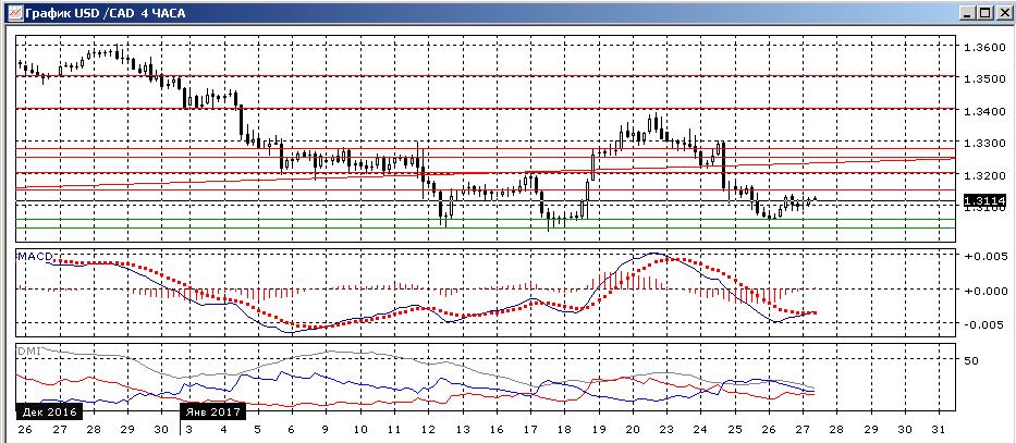 Пара достигла нового относительного минимума и приблизилась к важному уровню поддержки на 1,3030. Снижение от 1,3400 почти полностью вернулось к исходной точке коррекции на 1,3030. Уровень 1,3100 выступает сейчас сопротивлением =дане еэто была поддержка в октябре и декабре. Верхние тени последних свечей показывают, что скорее текущий отскок после приближения к 1,3030 является коррекционным, и снижение продолжится до этого уровня. По ADX снижение остаётся хорошо выраженной тенденцией — DM- существенно выше DM+, ADX остаётся на высоком уровне.