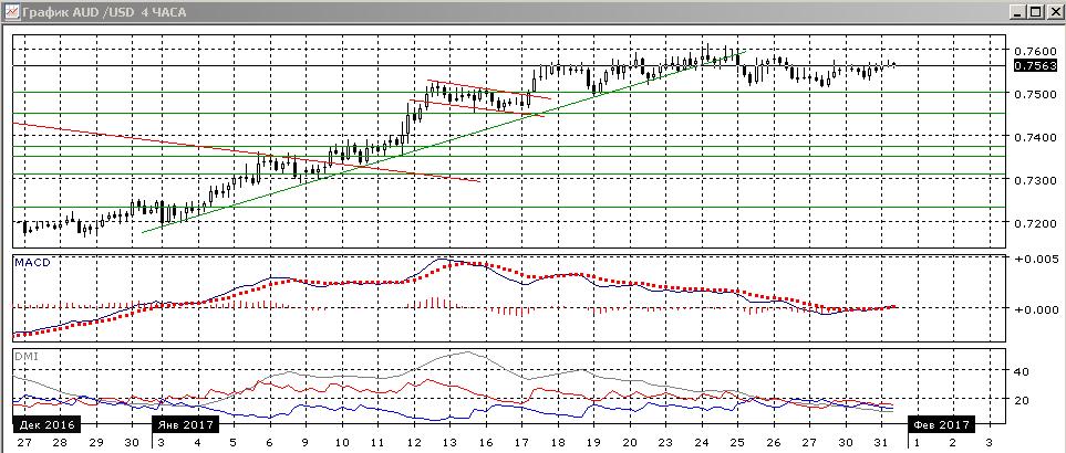 На дневном графике ситуация мало изменилась: пара остаётся ниже 0,7600, но выше 0,7500, она остаётся ниже линии восходящего тренда с начала января. Замедление движения привело к образованию свечей «дожи». Скорее, дальнейшее движение пары будет направлении выхода из диапазона 0,75-0,76. Сейчас ситуцаия неопределённая, так как не поддерживается снижение пары после преодоления линии восходящего тренда, но также не поддерживается и возобнопление роста — пара не выросла после хорошо выраженного «молота». По индикаторам направленного движения остаётся ситуация коррекции к снижению: гистограмма MACD снижается, но остаётся в положительной области, по ADX тенденция роста остаётся хорошо выраженной, со значительным превышением DM+ над DM-.