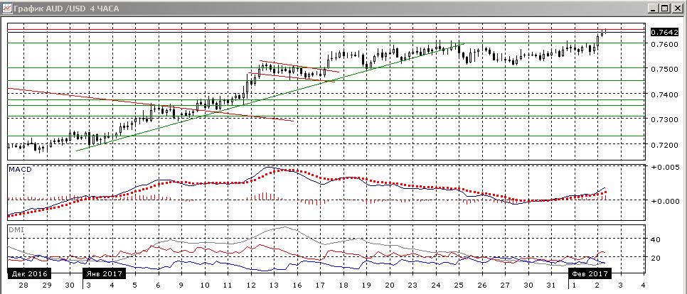 На четырёхчасовом графике пара остаётся выше уровня 0,7600, после первоначального прорыва рост замедляется, с образованием верхних теней у последних свечей. При откате уровень 0,7600 должен быть уже поддержкой. По индикаторам направленного движения пара также переходит к росту: DM+ выше DM-, гистограмма MACD растёт в положительной зоне, линия MACD имеет положительный наклон. Скорее, рост будет продолжаться, но после отката ближе к 0,7600.