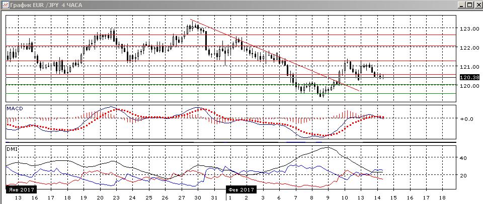 На четырёхчасовом графике возможно образование двойной вершины на 121,25, сейчас пара находится выше уровня промежуточного минимума на 120,20. Так как сопротивление в зоне 121-121,25 оказалось сильным, скорее коррекционное движение будет завершаться. По индикаторам направленного движения пара переходит к снижению — DM- снова выше DM+, гистограмма MACD перешла в отрицательную область, линия MACD развернулась. Как и более крупном масштабе, целью снижения видится уровень 119,50, около минимумов 7-8 февраля.