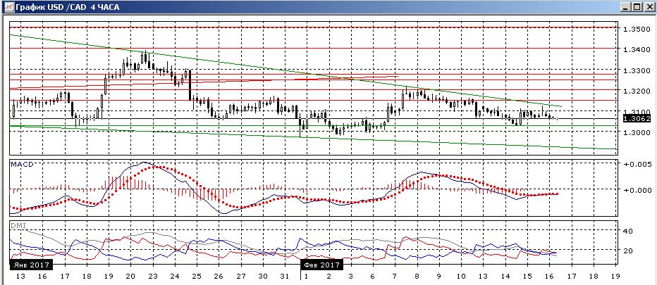 На дневном графике с целом ситуация не изменилась: пара продолжает снижение от 1,3200, ниже линии нисходящего тренда, если строить его с максимума конца декабря. При движении в большом клине между трендом с конца декабря и линией поддержки по минимумам с середины декабря, более вероятным видится продолжение снижения пары (нижняя граница будет около 1,2930). Пара достигла 14 февраля уровня поддержки 1,3030 (около минимумов 12 и 17 января), скорее этот уровень будет вновь тестироваться. Более сильной поддержки можно ждать на 1,3000 (это «круглый» уровень и зона, от которой начался отскок в конце января). По ADX снижение остаётся устойчивой тенденцией — превышение DM- над DM+ большое и устойчивое, при относительно высоком уровне ADX.