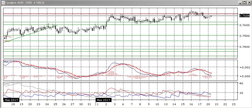 На четырёхчасовом графике также видно возвращение пары в канал 0,7600-0,7700 после попытки пробоя верхнего уровня. Исходя из движения в канале, уровень 0,7700 продолжает оставаться основным сопротивлением и предпочтительно движение к нижней границе. По индикаторам направленного движения в этом масштабе флэт (это подтверждает движение в канале).