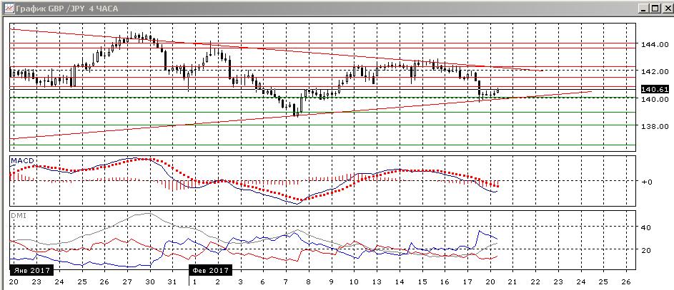 На четырёхчасовом графике пара растёт от 140,00, текущий отскок кажется коррекционным к снижению, размер роста небольшой. По индикаторам направленного движения тенденцией стало снижение — DM- устойчиво выше DM+, гистограмма MACD находится на отрицательной территории, линия MACD имеет отрицательный наклон. Пока пара выше 140,00 и линии тренда с середины января, в рамках движения в треугольнике предпочтительно движение вверх до более долгосрочного тренда.