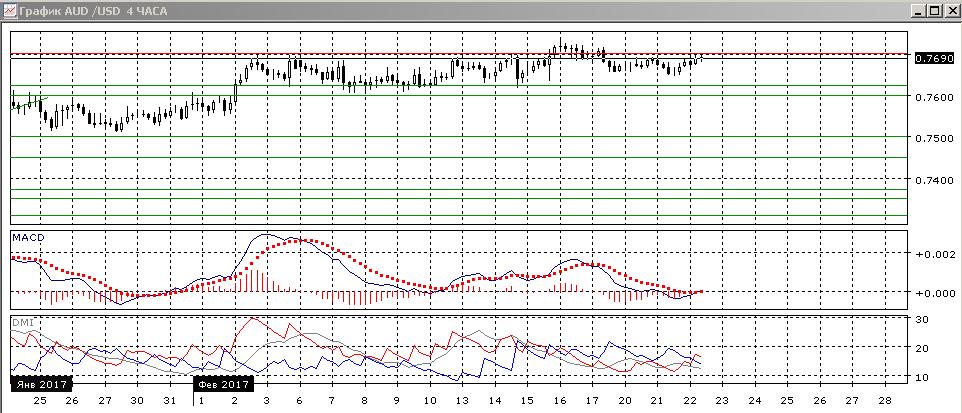 На дневном графике пара не снизилась до нижней границы консолидации 0,76-0,77, после того, как вернулась в эти границы после пробоя 15 февраля. Образование «падающей звезды» во вторник приводит к новой попытке тестирования уровня 0,7700. Определяющим для перспективы остаётся устойчивость этого уровня сопротивления. Пока пара в канале, предпочтительным видится снижение до нижней границы 0,7600. При закреплении выше 0,7700, предпочтительным видится продолжение роста до 0,7800 (размер движения, равный ширине канала). По индикаторам направленного движения флэт — Adx на низком уровне, гистограмма MACD около нуля, линия MACD разворачивается вверх.