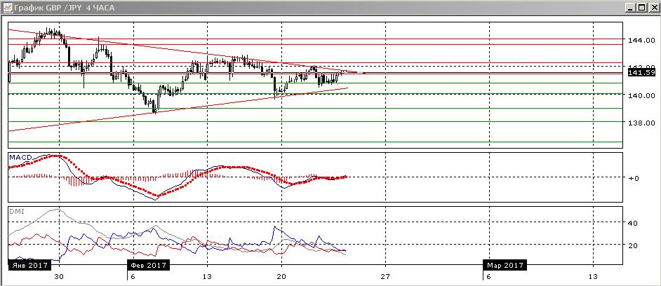 На дневном графике пара остаётся у линии нисходящего тренда, если строить её с декабря по максимумам января и февраля. Возвращение пары к верхней границе, после приближения её к уровню сопротивления 142,25 и линии тренда, скорее показывает что снижение сейчас не поддерживается. Предпочтительным направлением выхода из треугольника видится сейчас рост, но стоит дождаться результата. При закрытии выше 142,25 продолжение роста будет предпочтительным — это было бы закрытие выше уровня сопротивления в середине февраля и закрытие выше линии нисходящего тренда. По ADX снижение по-прежнему является тенденцией: DM- выше DM+. На четырёхчасовом графике пара находится на самой линии тренда, но пока остаётся в треугольнике. Скорее, сейчас стоит подождать выхода пары из треугольника. По индикаторам направленного движения в этом масштабе флэт. На 140,80 вновь проявилась сильная поддержка, что при преодолении сопротивления на 141,50 делает продолжение роста немного более предпочтительным.
