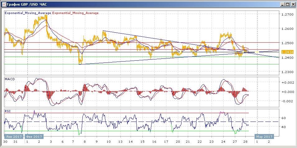 в четверг пара вышла из треугольника вверх с ростом на 100 пунктов и закрытием на уровне 2-недельного максимума выше 1.2550. в пятницу , после неоднократных тестов сопротивления на 1.2550, пара также резко ушла вниз, закрывшись на 1.2449. вчера торги завершились почти без изменений, хотя пара и уходила в ходе торгов ниже 1.2400. Сегодняшние торги проходят со слабым снижением пары. Средние скользящие ЕМА21 и ЕМА55 пересеклись вниз и начали снижаться. Индикаторы MACD и RSI находятся ниже своих центральных линий и сегодня склонны к снижению.
