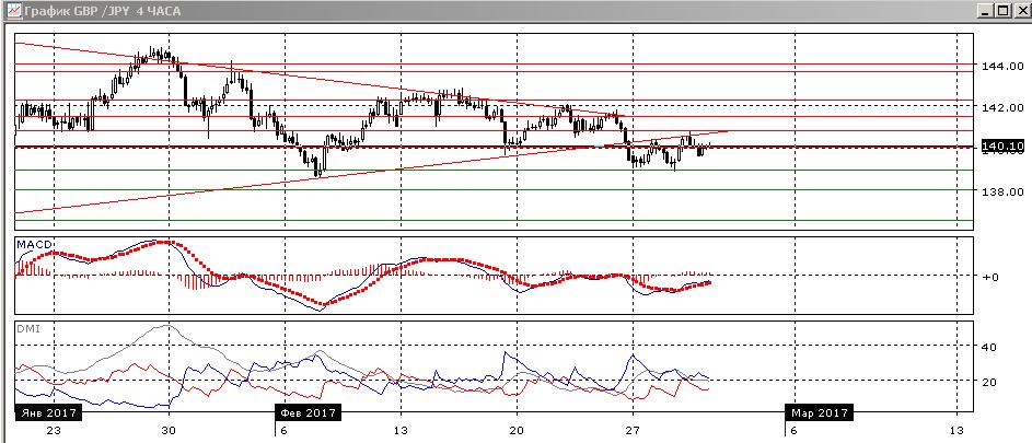 На четырёхчасовом графике в целом картина выхода из треугольника вниз также не нарушена: пара возвращалась к преодолённой линии тренда два раза, но в результате снижалась от неё. Около 139,00 образовалось двойное дно, но пара остаётся ниже промежуточной вершины. По индикаторам в этом масштабе снижение немного предпочтительно, хотя (DM- выше DM+), но тенденция слабая — гистограмма MACD колеблется около нуля, гистограмма MACD также колеблется. Пока более предпочтительным видится новое тестирование уровня 139,00.