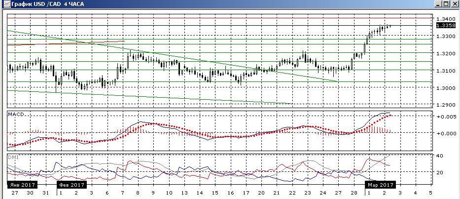 На дневном графике после тестирования уровня 1,3030 и приближения обратно к линии нисходящего тренда с конца декабря пара резко выросла. При этом целевой уровень роста (1,3400 / максимум середины января) был почти достигнут. Однако импульс был сильным, и скорее движение вверх ещё продолжится, хотя по размеру движения, равному волне с 18 января, цель также близка (немного выше 1,34). Исходя из этого, можно предположить откат после тестирования 1,3400, хотя бы и в качестве коррекции к волне роста. По индикаторам направленного движения тенденция роста усиливается: превышение DM+ над DM- увеличивается, гистограмма MACD растёт в положительной золе, линия MACD направлена вверх. На часовом графике ситуация похожая — сильное движение, подтверждаемое индикаторам направленного движения. По мере приближения к целевому уровню 1,3400 рост замедляется.