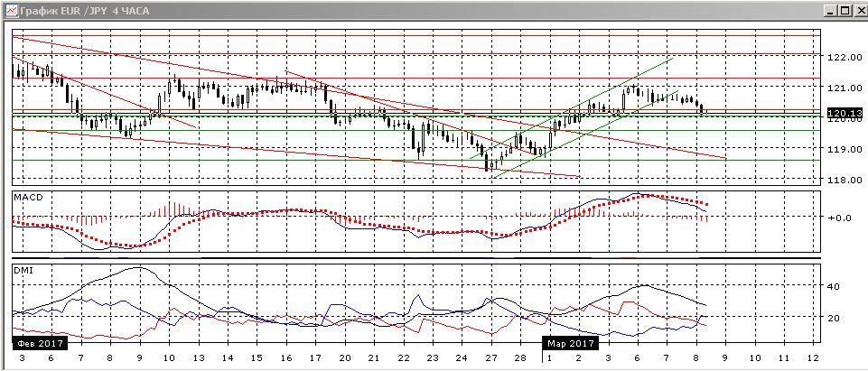 На четырёхчасовом графике пара снизилась ниже нижней границы восходящего канала с 27 февраля, и после остановки около уровня 120,60 перешла к снижению, при этом был преодолён уровень поддержки 120,25 (этот уровень хорошо работал в феврале). Пара достигла минимума 3 марта около 120,00. В краткосрочной перспективе снижение, вероятно, будет продолжаться, но в более долгосрочной перспективе скорее рост возобновится.