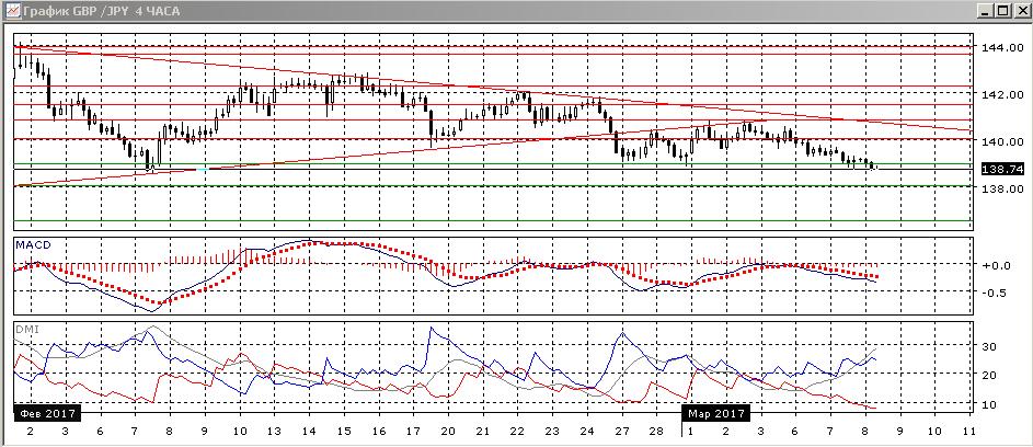 На четырёхчасовом графике пара перешла к снижению от уровня 140,80 (это был уровень поддержки несколько раз в течении февраля), Сейчас пара находится ниже важного уровня поддержки на 139,00 (около минимумов конца февраля, после образования двойного дна на этом уровне пары выросла с 28 февраля. Сейчас тенденция снижения выглядит сильной, и скорее оно будет продолжаться. По ADX тенденция снижения достаточно сильная, но по гистограмме MACD новые минимумы пары не подтверждаются новыми минимумами ADX. Это увеличивает вероятность отскока от 139,00, поэтому лучше дождаться преодоления этого уровня.