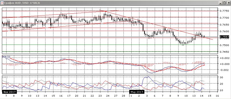 На четырёхчасовом графике пара после отката от 0,7600 приостановила снижение выше 0,7550, на этом же уровне было образовано «дно» 3 марта, поэтому при его преодолении до 0,7500 обоснованного уровня поддержки не видно. Пара также находится на уровне краткосрочной линии нисходящего тренда с 23 февраля — с одной стороны, это укрепляет поддержку на 0,7550, но с другой стороны, если пара вернётся ниже линии тренда, это показало бы, что пробой не удался. Ситуация, скорее, является немного более предпочтительной для снижения, но при новом росте к 0,7600 и преодолении этого уровня образовалась бы фигура «голова-плечи» с плечами около 0,7500.